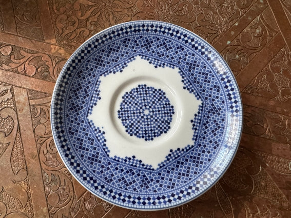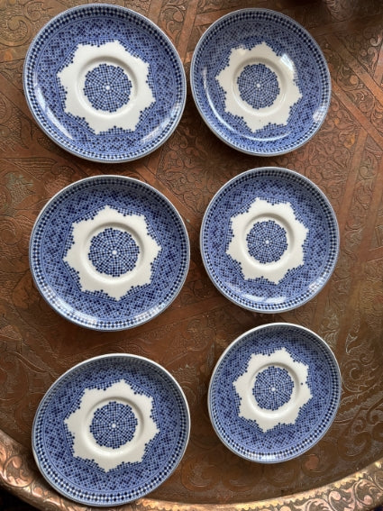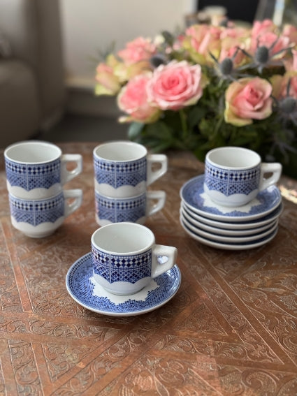Très joli lot de 6 tasses à café et sous-tasses fabriqués à Fès au Maroc par la marque COCEMA (Complexe Céramique du Maroc), disparue en 2009 à la suite d'un incendie. Décor traditionnel de mosaïque bleue et blanche, plein de douceur. Les pièces vintage COCEMA sont recherchées par les amateurs.