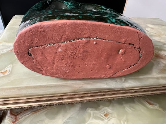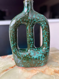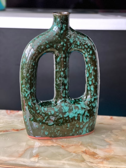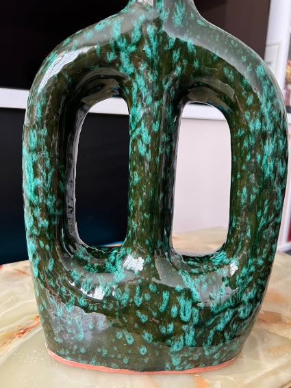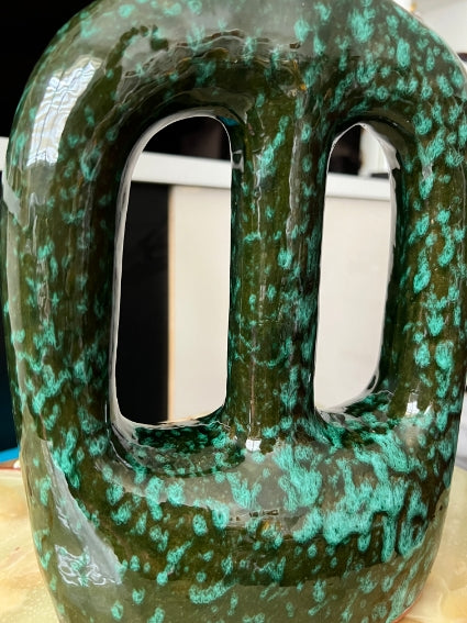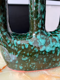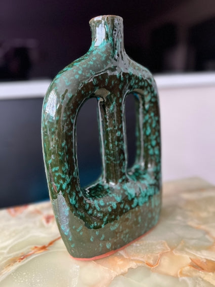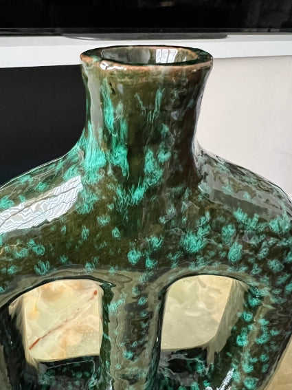 Magnifique vase en céramique émaillée, fabriqué à Marrakech à partir d'argile rouge. De couleur verte, avec des touches de turquoise, ce vase est très décoratif. Il a une belle présence, et se marie très bien avec un intérieur design.