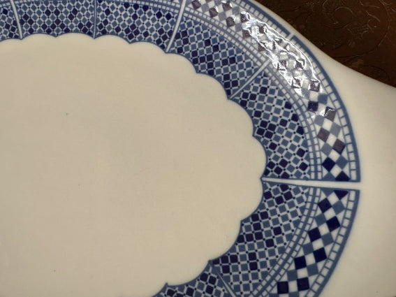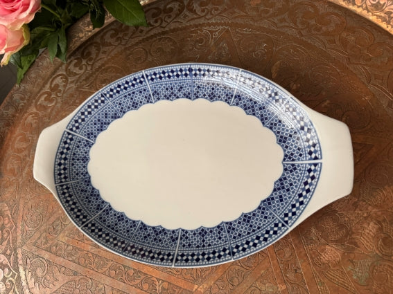 Joli plat ovale fabriqué à Fès au Maroc par la marque COCEMA (Complexe Céramique du Maroc),  disparue en 2009 à la suite d'un incendie. Décor traditionnel de mosaïque bleue et blanche, plein de douceur. Les pièces vintage COCEMA sont recherchées par les amateurs.