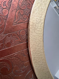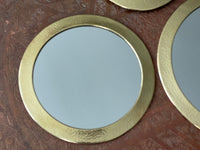 Très jolie série de 3 miroirs ronds, encadrés de laiton martelé. Ils sont réalisés à la main par un artisan ferronnier de Marrakech au Maroc. Ils disposent chacun d'un crochet au dos pour les fixer au mur.