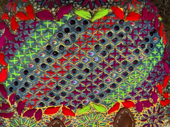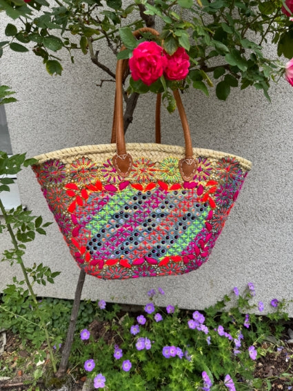 Très joli panier tressé à la main au Maroc, avec de la feuille de palmier. Il est entièrement décoré de motifs multicolores et dorés pleins de gaieté. Il est équipé d'anses longues en cuir, permettant de porter le panier à l'épaule.