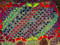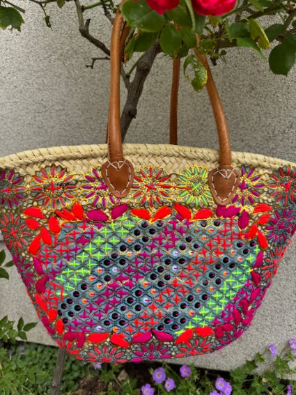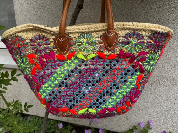 Beautiful basket hand-woven in Morocco, with palm leaf. It is entirely decorated with cheerful multicolored and gilded motifs. It features leather handles, allowing the basket to be carried on the shoulder.