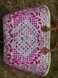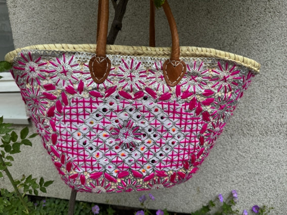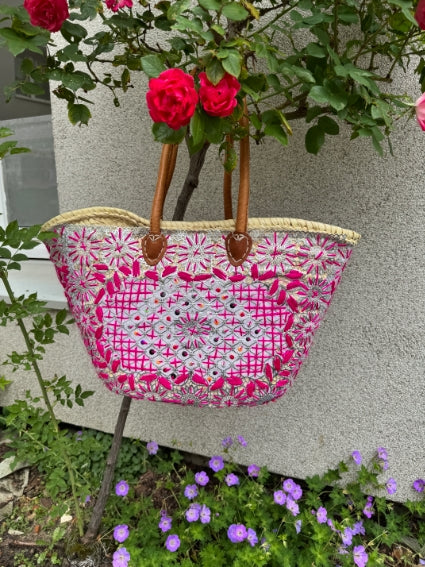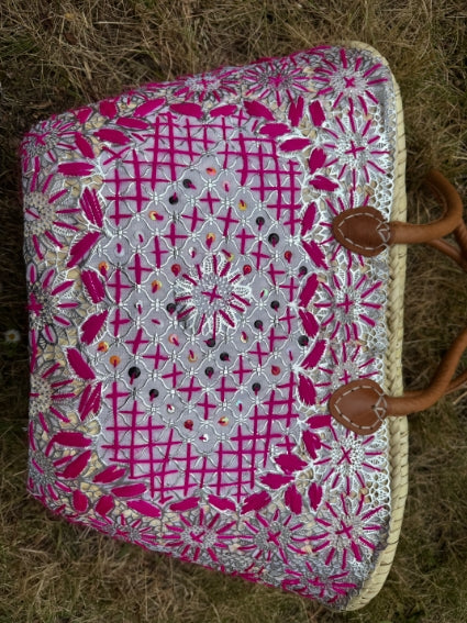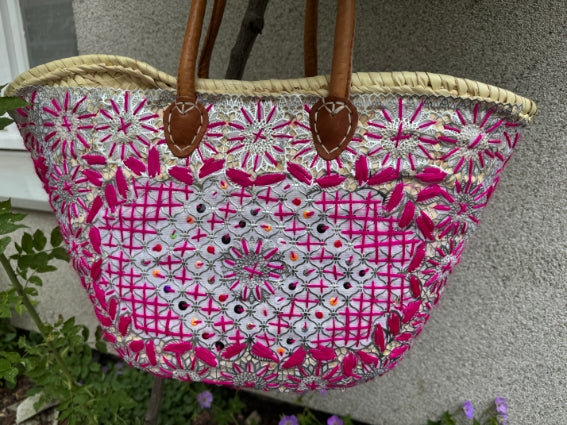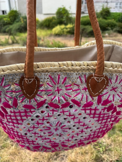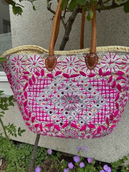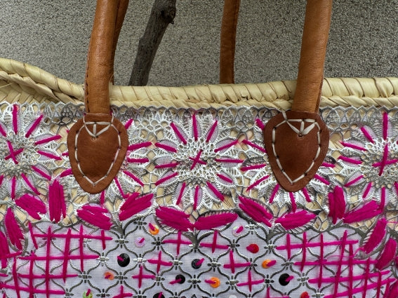 Beautiful basket hand-woven in Morocco, with palm leaf. It is entirely decorated with pink and silver motifs. It features leather handles, allowing the basket to be carried on the shoulder.