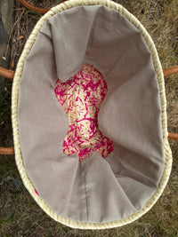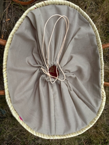 A piece of fabric, sewn inside, can be tightened with a cord to close the basket.