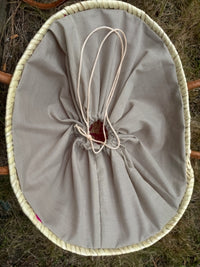 Une pièce de tissu, cousue à l'intérieur, peut être resserrée avec un cordon afin de fermer le panier.