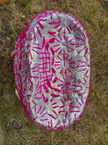 Très joli panier tressé à la main au Maroc, avec de la feuille de palmier. Il est entièrement décoré de motifs roses et argentés. Il est équipé d'anses longues en cuir, permettant de porter le panier à l'épaule.