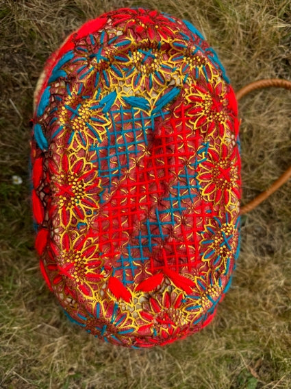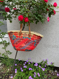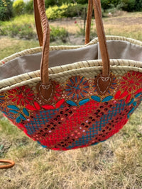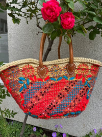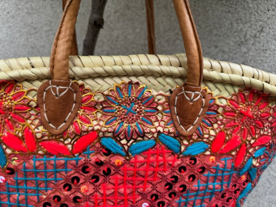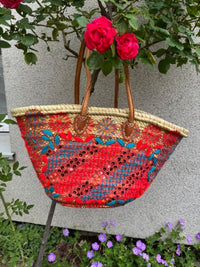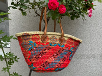 Beautiful basket hand-woven in Morocco, with palm leaf. It is entirely decorated with cheerful red and blue motifs. It features leather handles, allowing the basket to be carried on the shoulder.