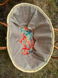 A piece of fabric, sewn inside, can be tightened with a cord to close the basket.