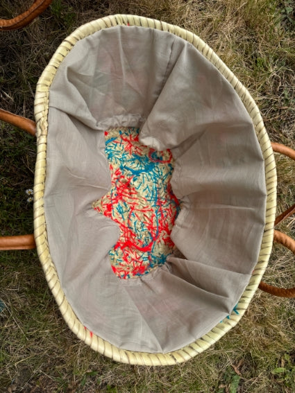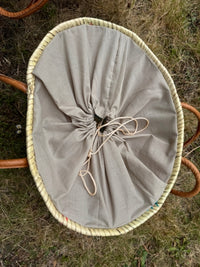 Une pièce de tissu, cousue à l'intérieur, peut être resserrée avec un cordon afin de fermer le panier.