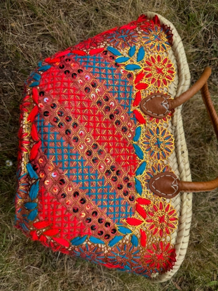 Panier tressé à la main à Marrakech, motifs rouges et  bleus, longues anses cuir (N4)